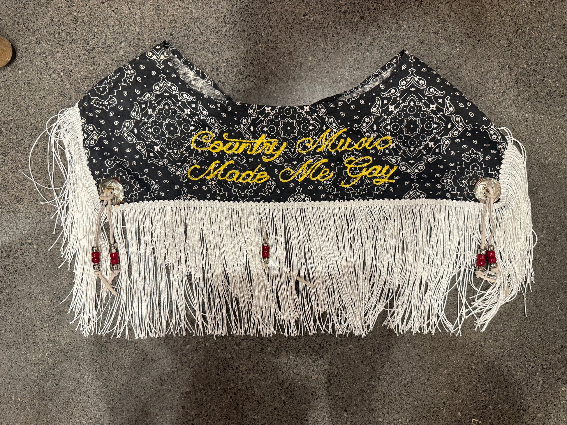 Features: This black and white vintage bandana scarf features all-over white fringe, a silver concho in front + "Country Music Made Me Gay" in yellow chainstitching across the back. Some usual wear around the concho.