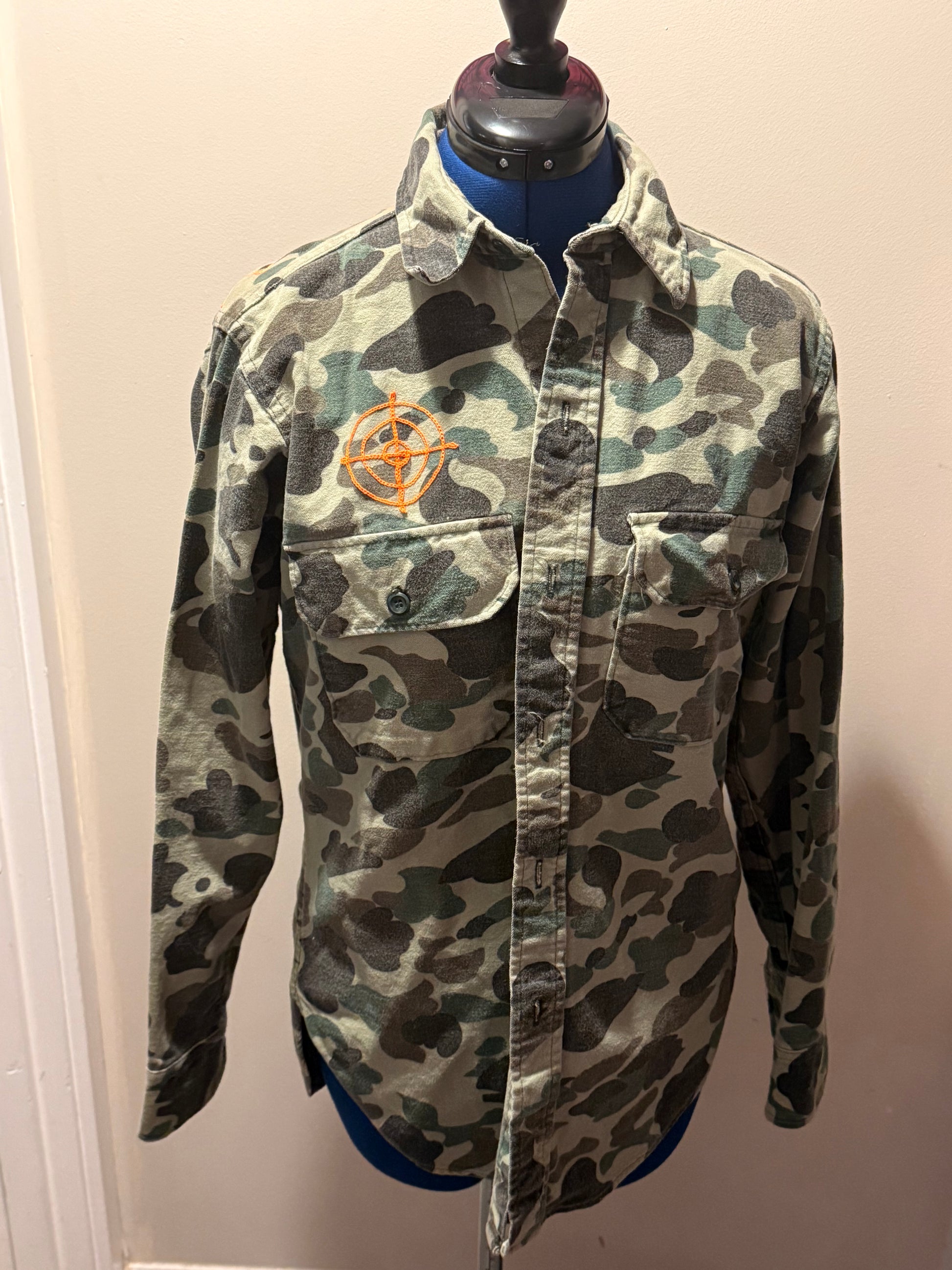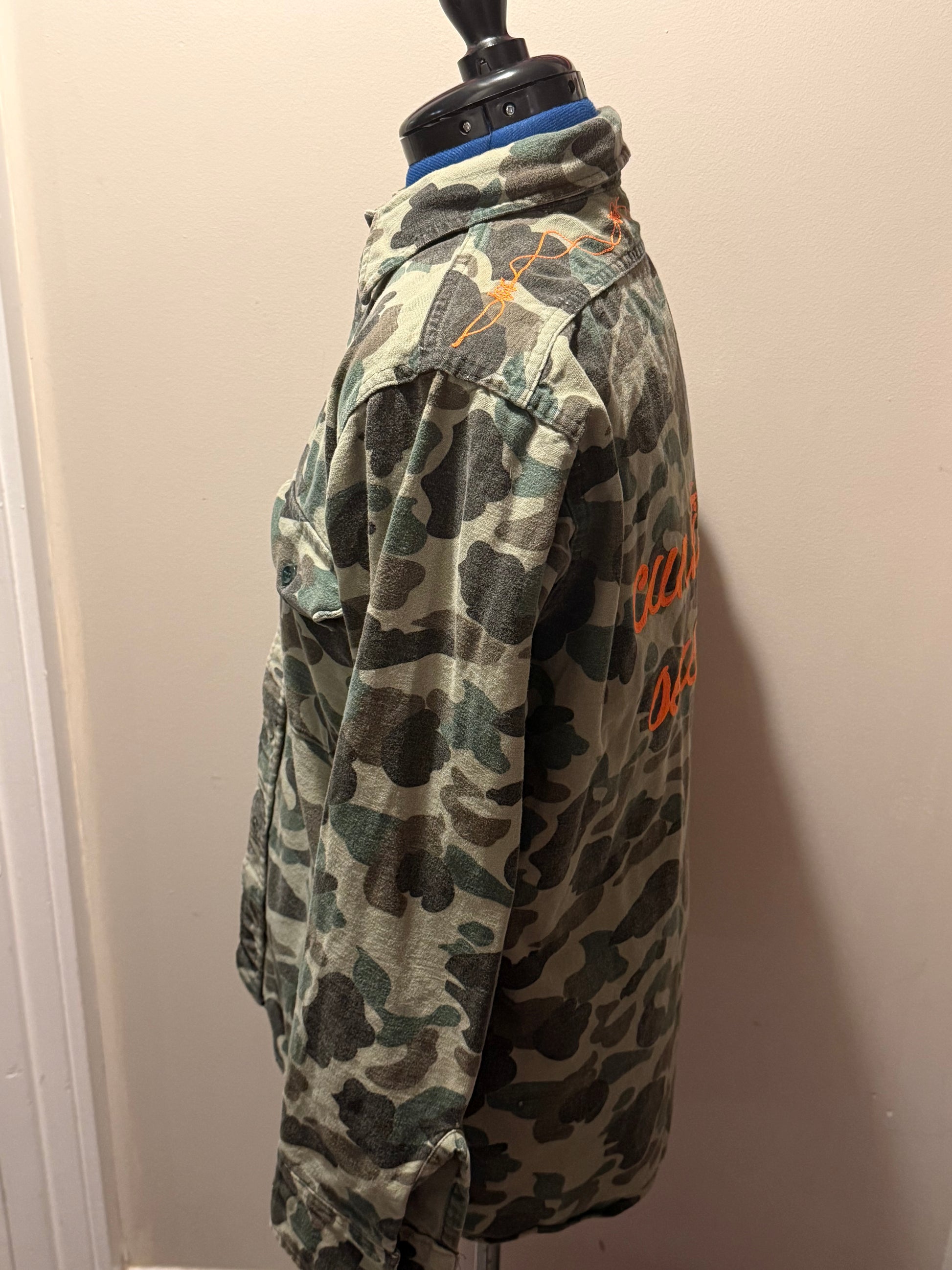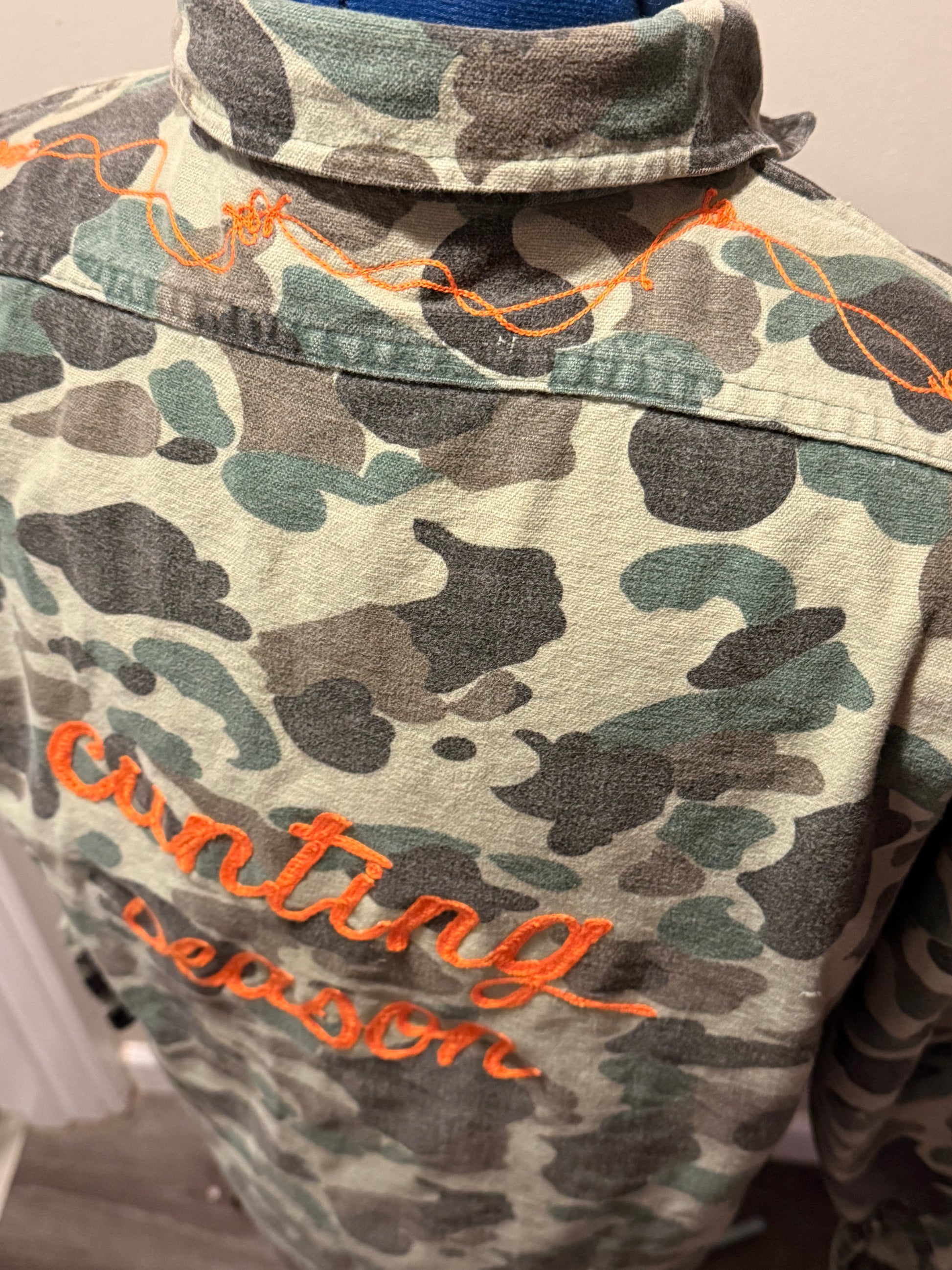 Features: Vintage, broken-in camo long-sleeve button-down shirt with "Cunting Season" across the back, barbed wire across the top back and a target symbol on the chest. All stitching in blaze orange. 100% Cotton, Made in USA