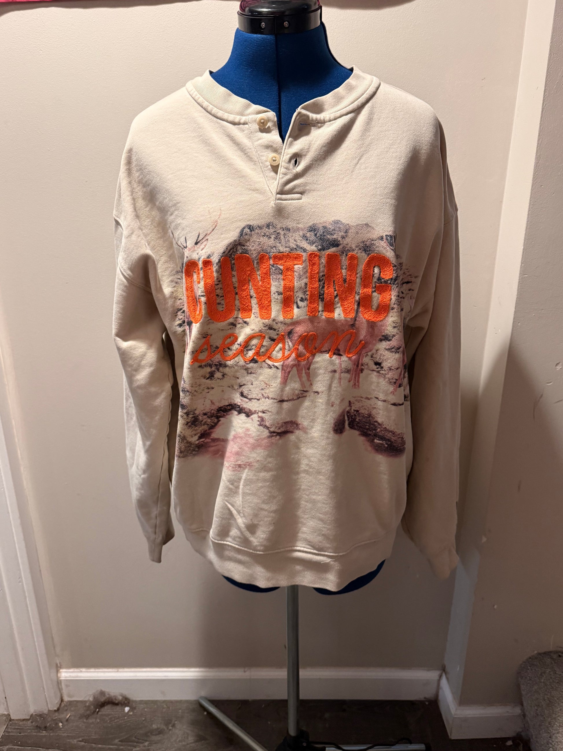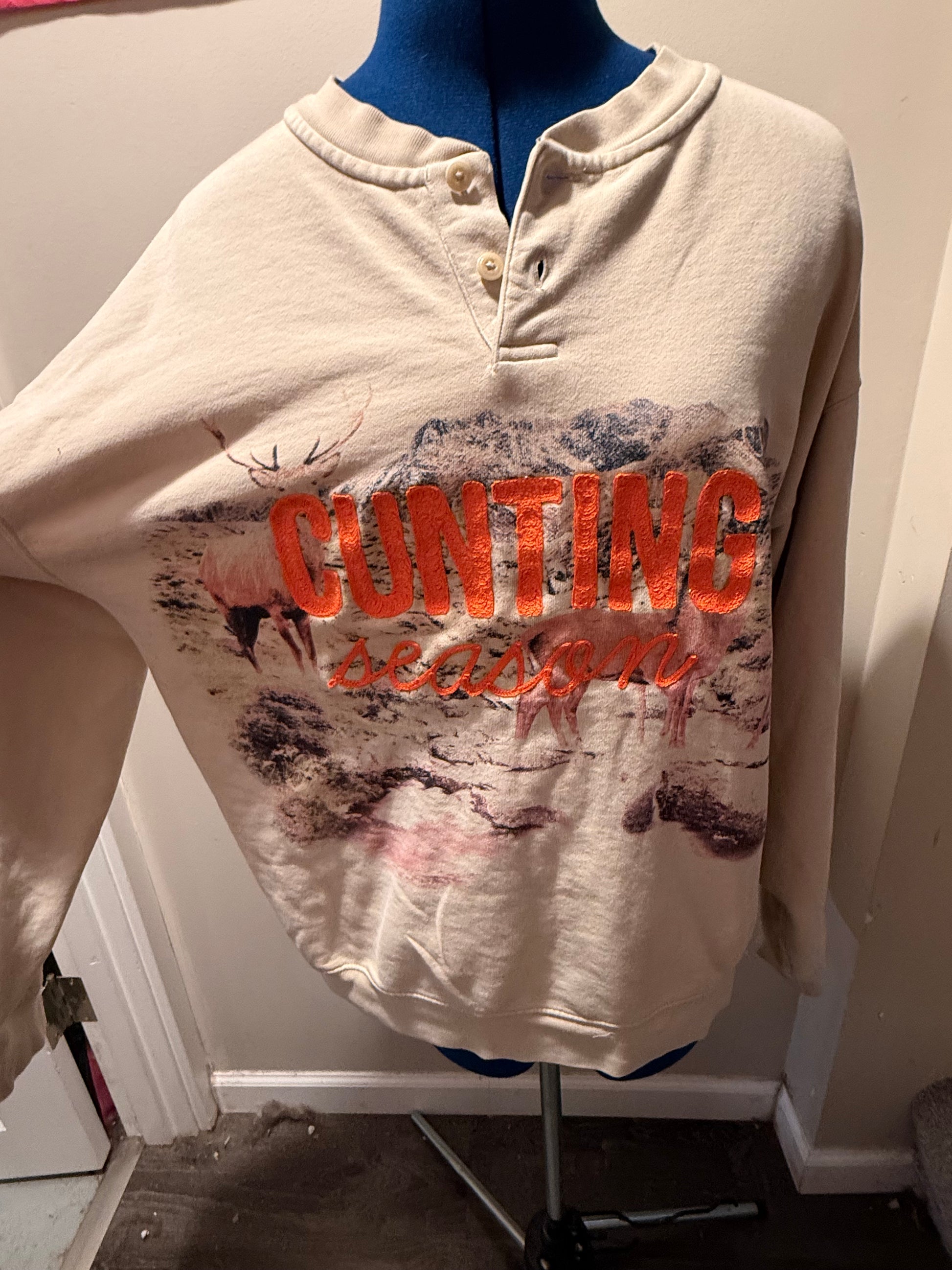 Features: A heavy henley style shirt with two-button closure at neckline. "Cunting Season" in orange thread across deer in clearing graphic across chest, target with heart arrow in orange thread on back.