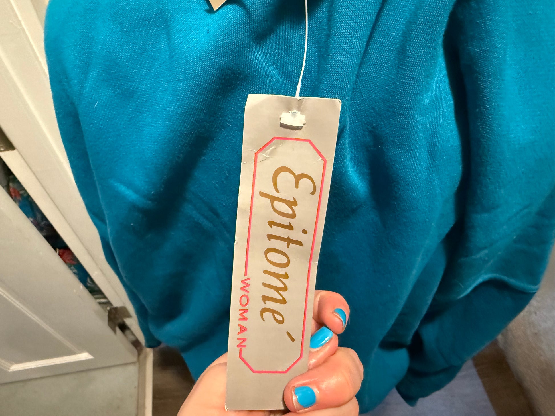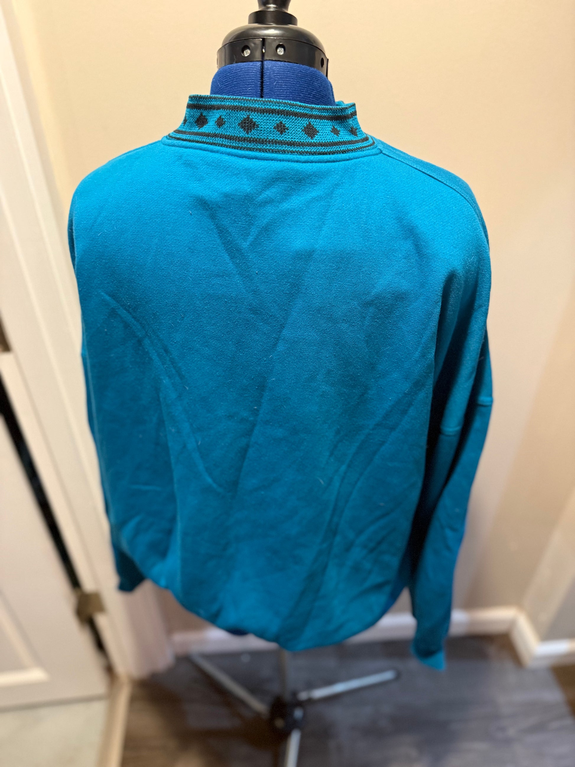 Features: Deadstock with tags, shoulder pads, quarter snap up closure with woven mockneck, long sleeves, elastic bottom hem + wrist collars, polyester + cotton, super cozy winter sweater that tells everyone they need to know: You're good in bed at napping.