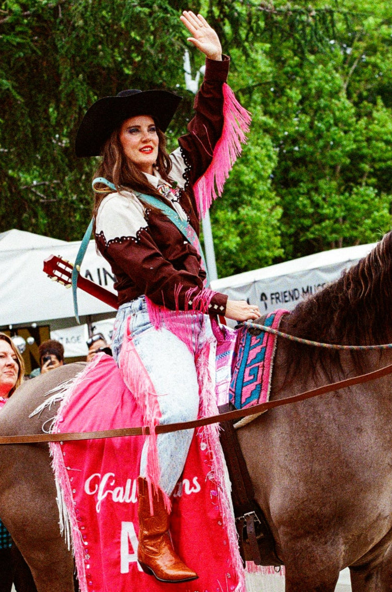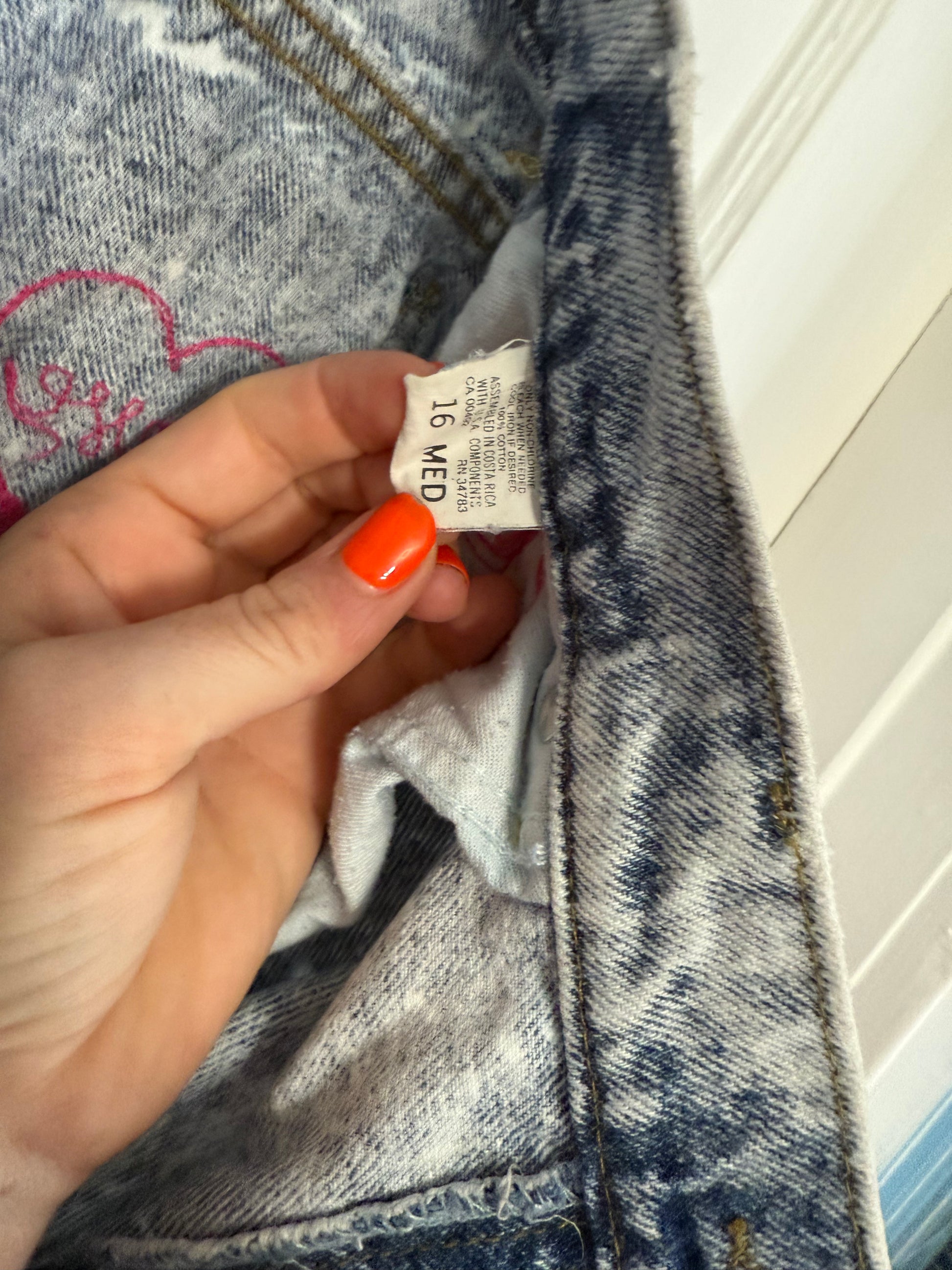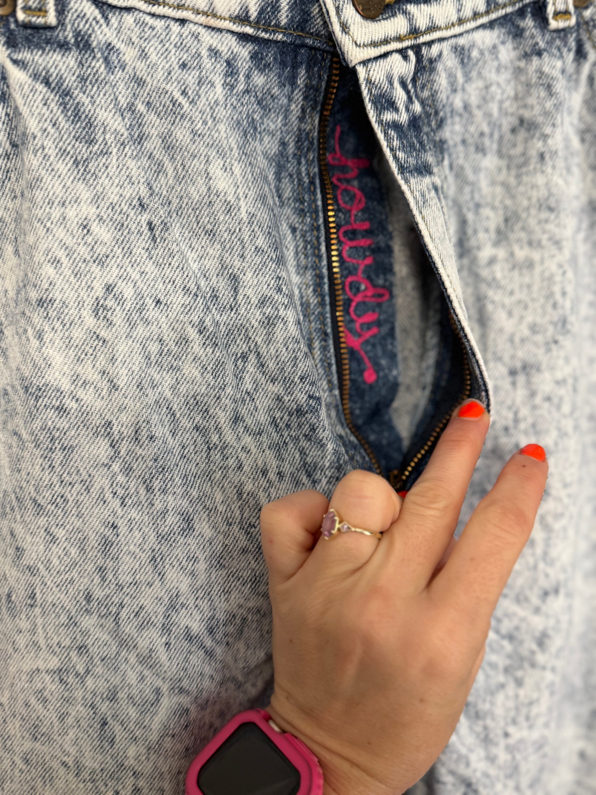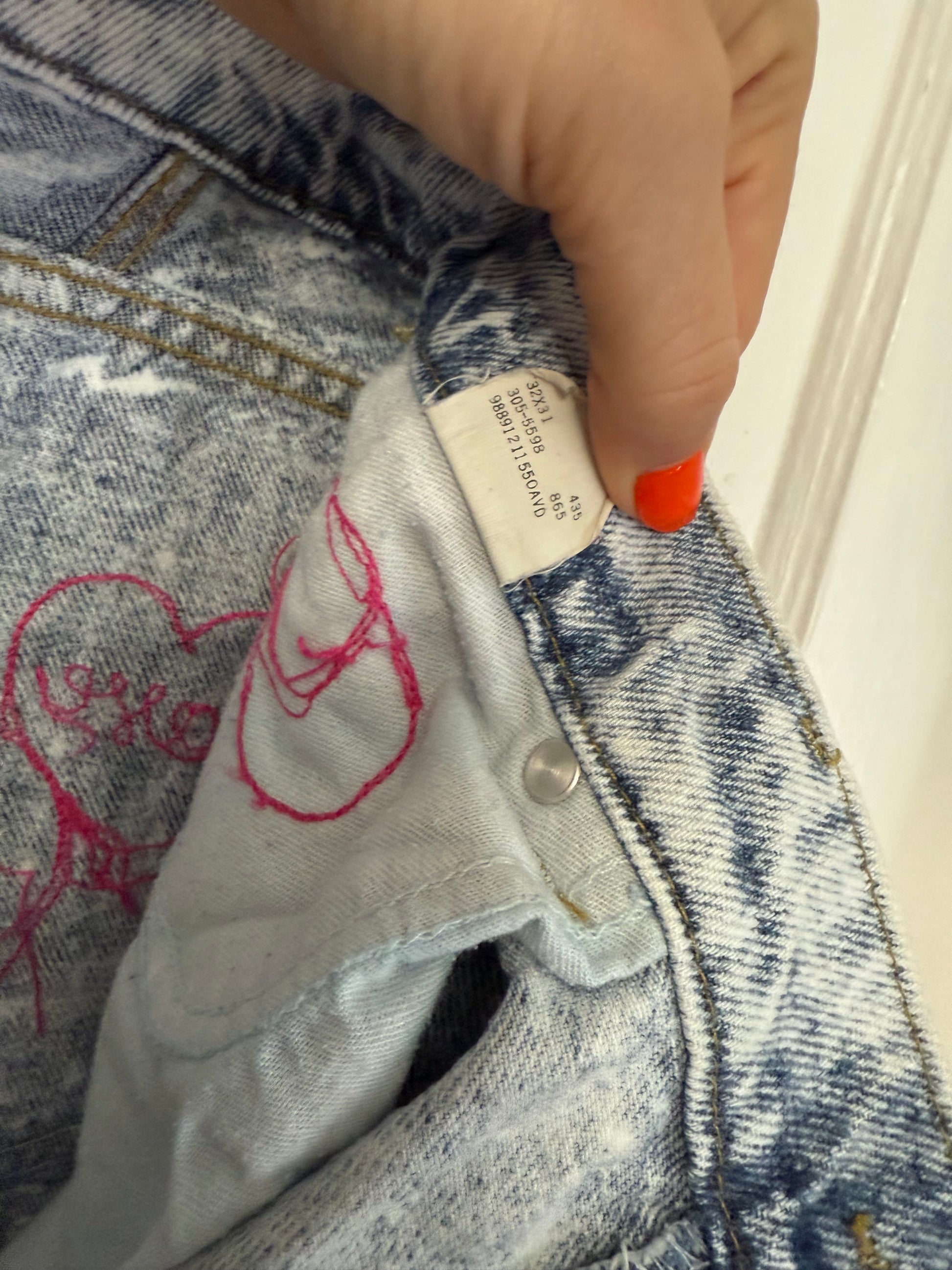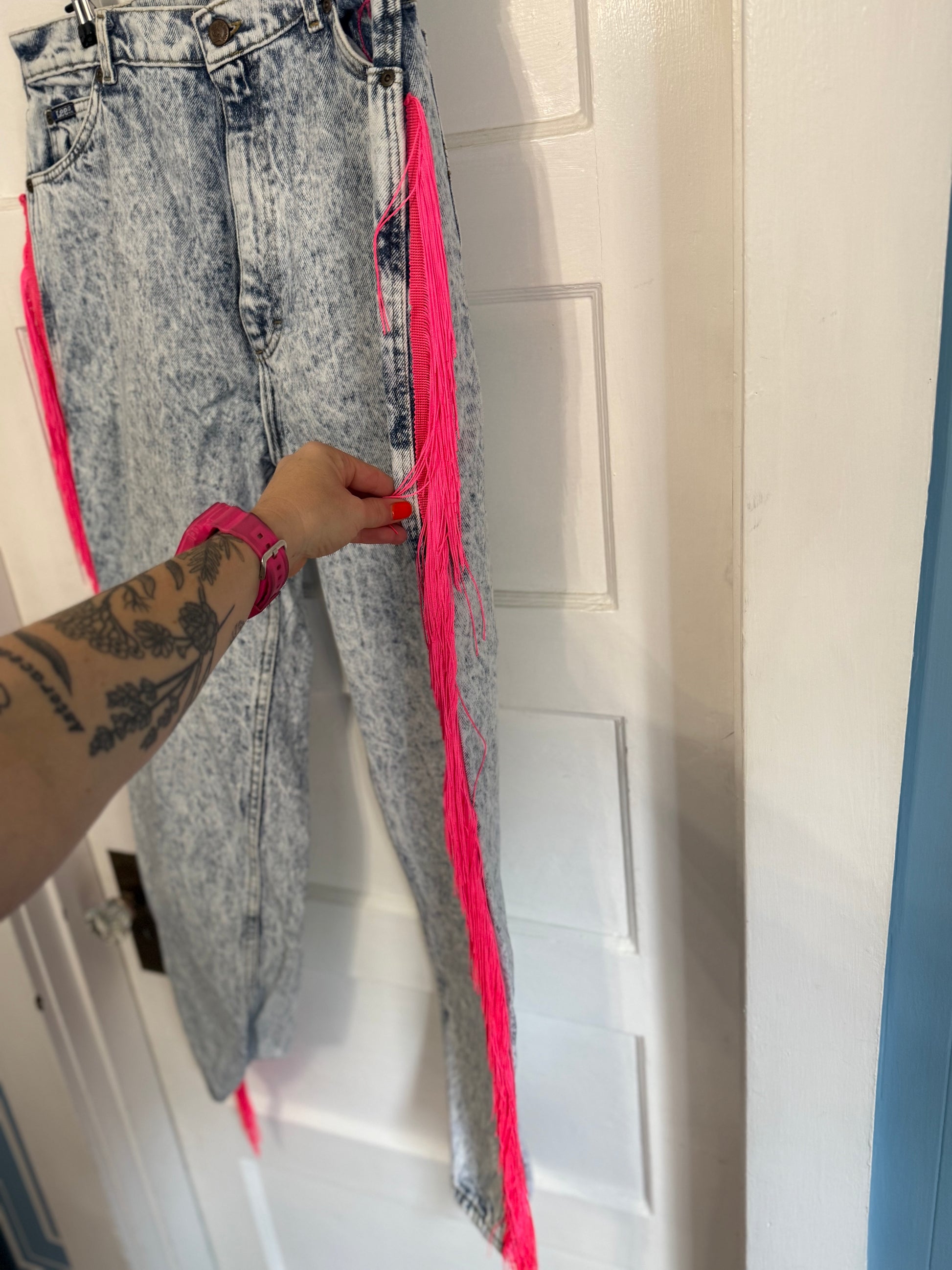 Features: Vintage light acid wash denim tapered straight jeans, adorned with neon pink fringe on the outer edge of each leg. Chainstitched conversation hearts on each rear pocket read "Have Love" + "Will Travel." The front left pocket has a tiny cowboy hat stitched in pink + a special surprise is stitched in the zip fly.