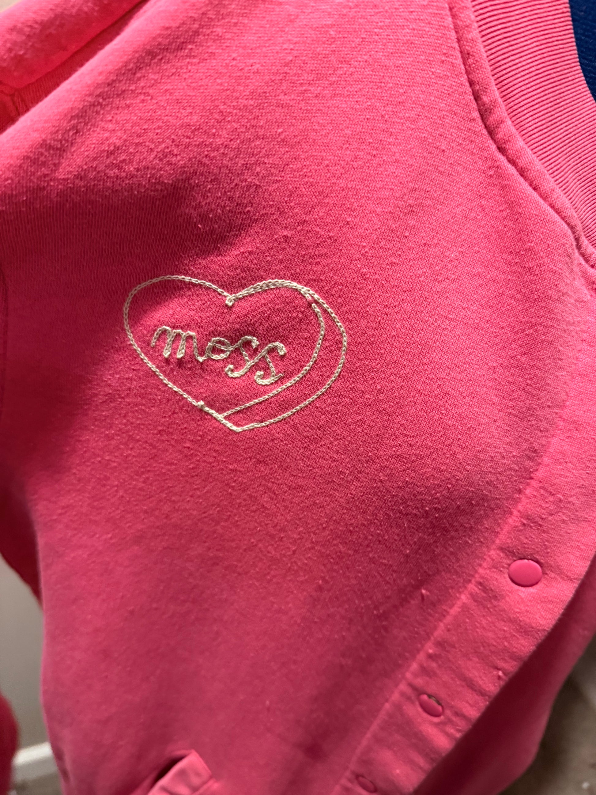 Features: OMG isn't Moss just great? So soft, so spongy, so weird. This vintage pink snap cardigan has a conversation heart with "moss" in beige in it. Two side pockets.