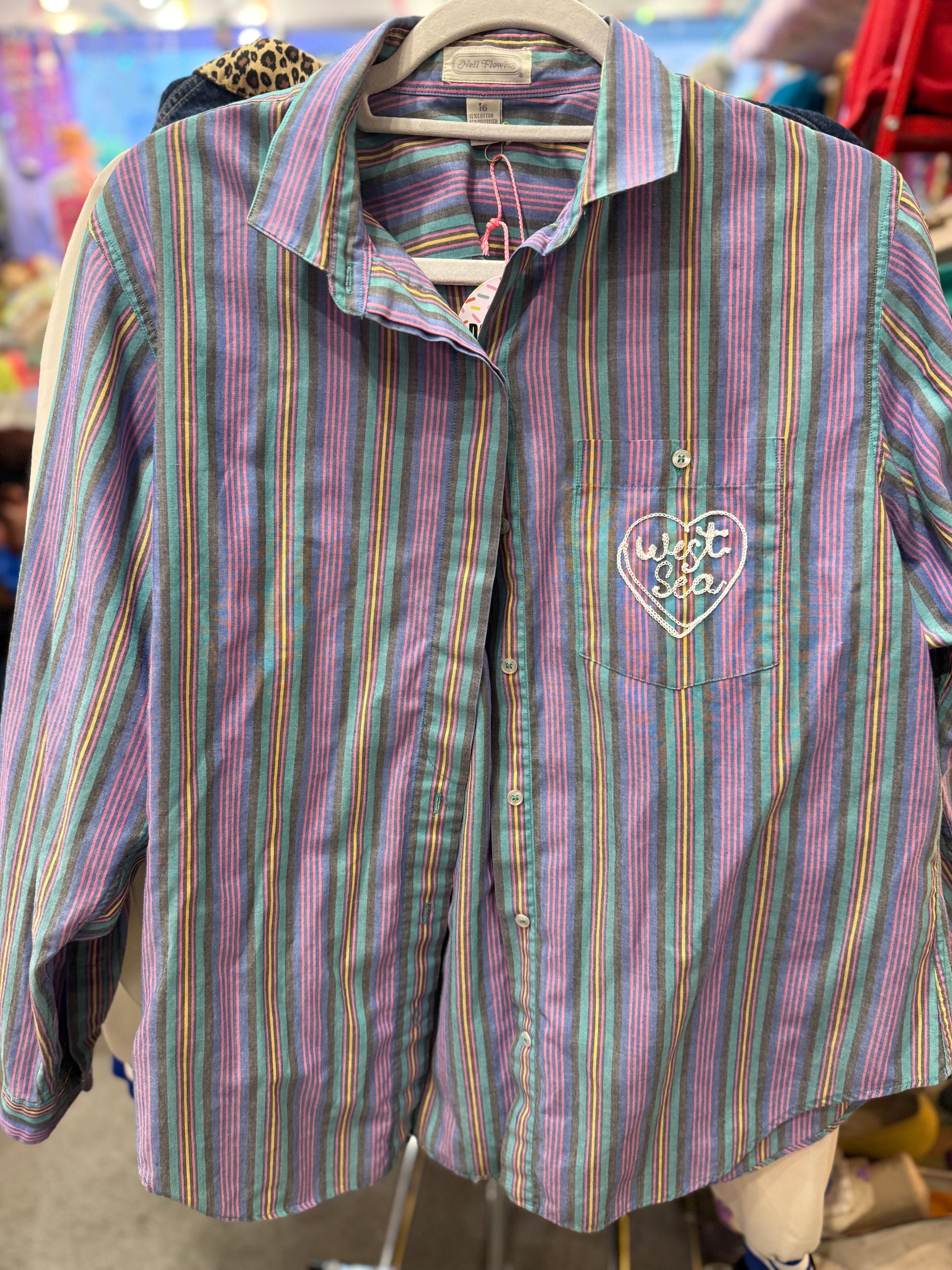 Features: Share your love of the peninsula with this I <3 West Sea collared, button-up shirt. Vintage pastel stripes, cotton + polyester