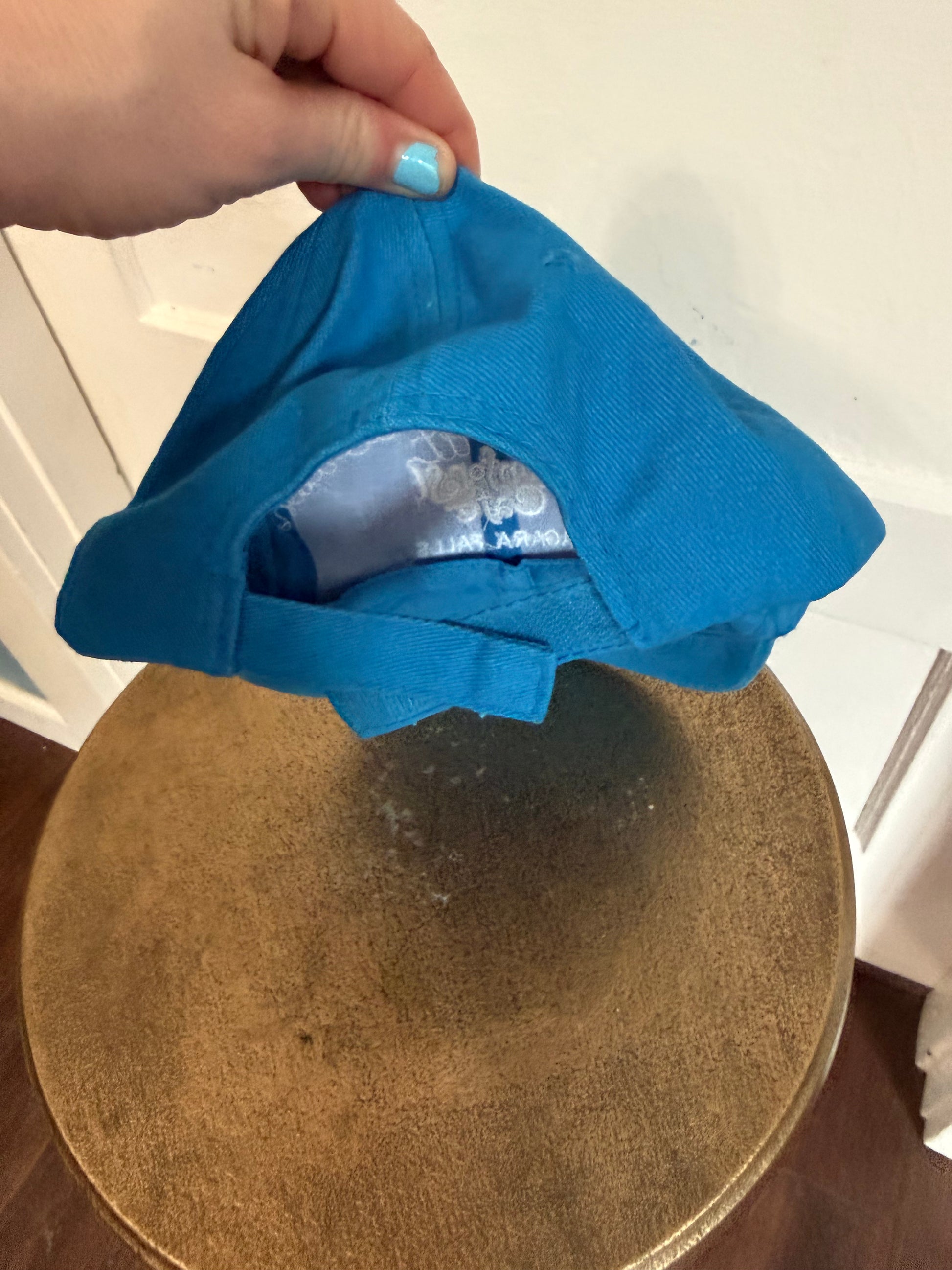 Features: Hook + loop adjustable back of the hat, bright blue with white stitching.