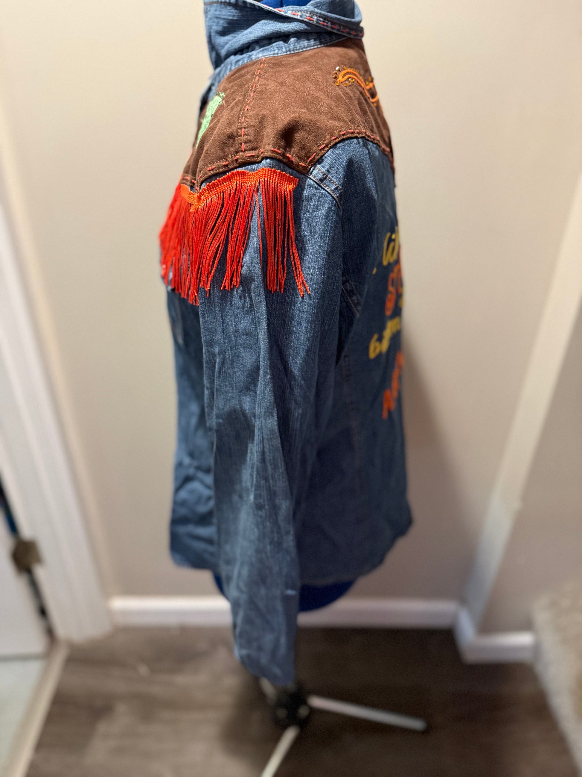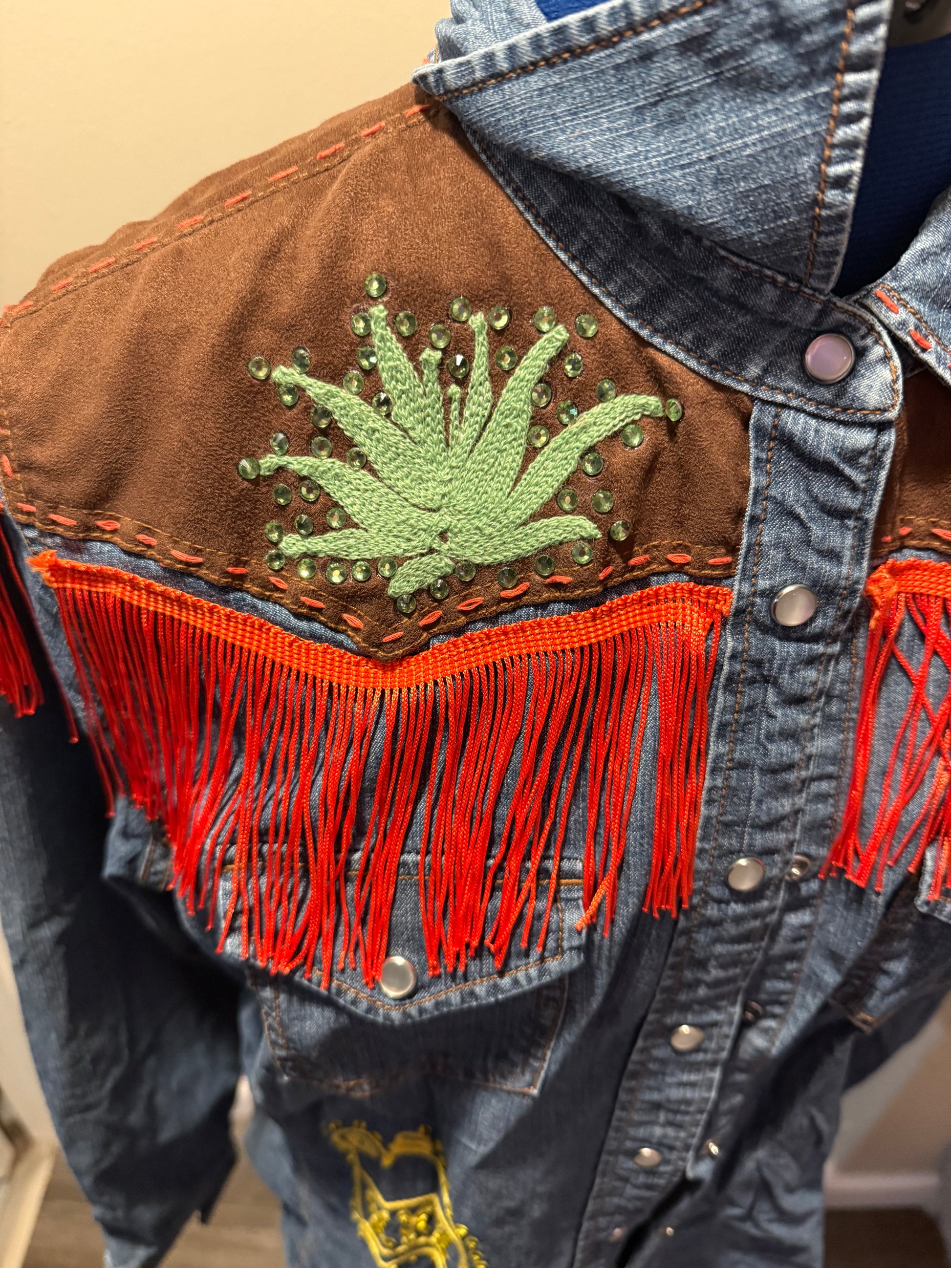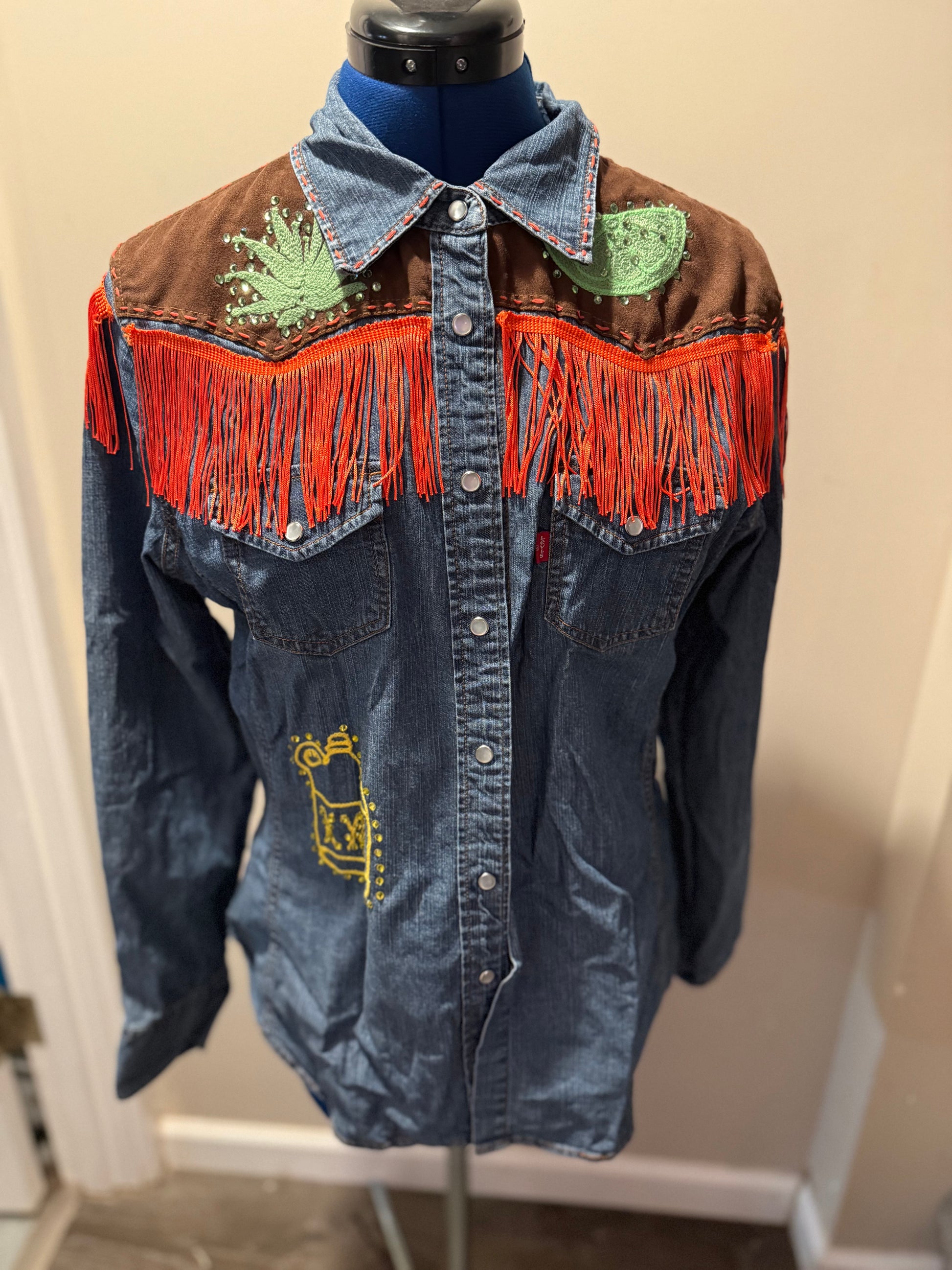 Features: This unique vintage Levi's suede + denim pearl snap collared shirt is a special nod to the Old West with a queer twist. The front features a stitched aloe plant, lime slice + moonshine-style jug with bright orange fringe. The back has a bull skull with flowers and the heart of the shirt: "I like my tequila straight but my friends can go any way."
