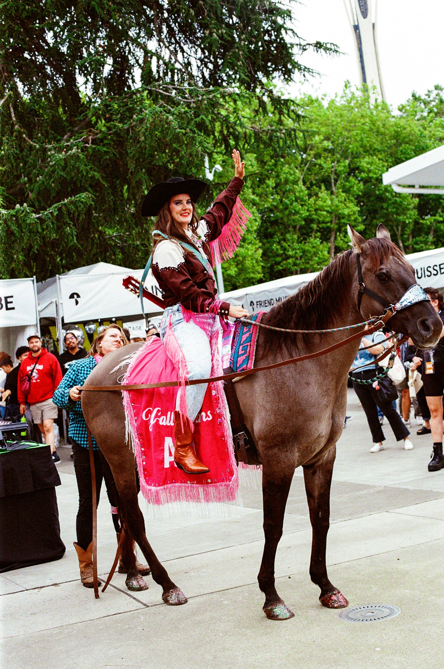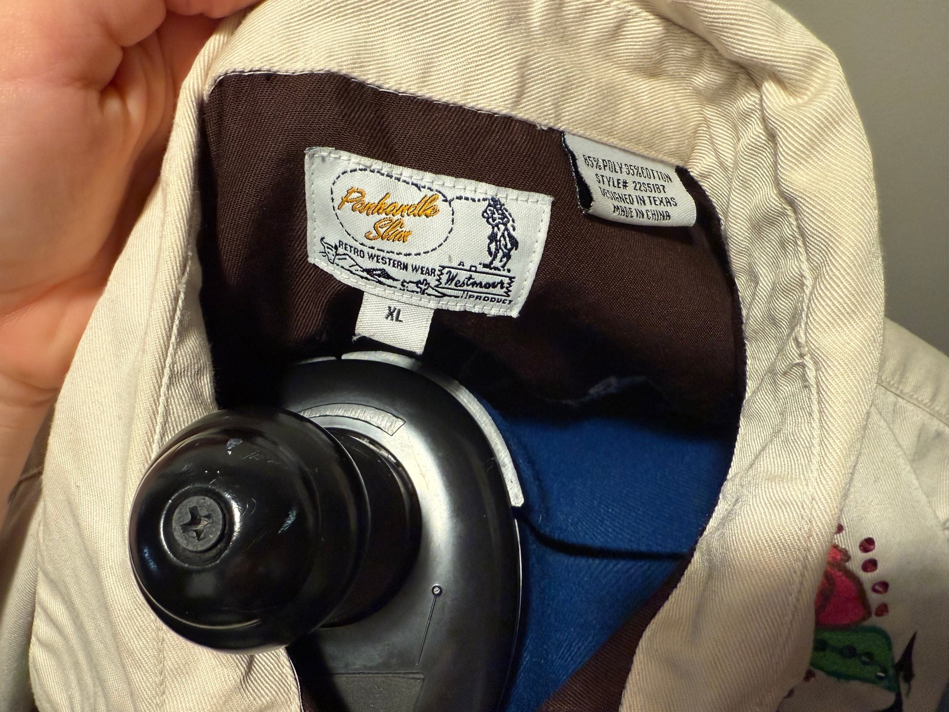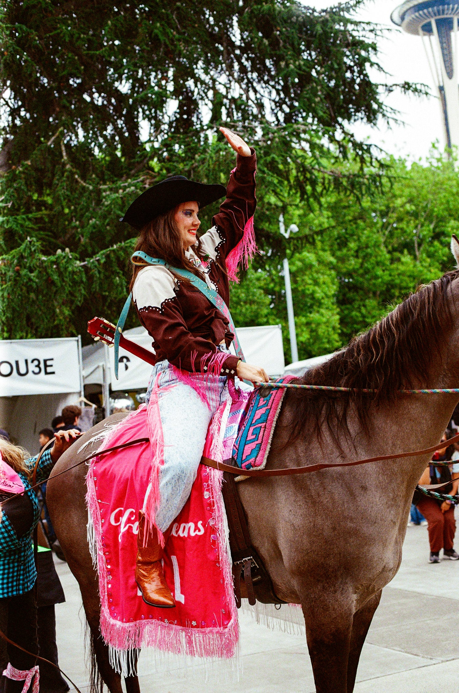 Features: An expression of queer joy on a vintage western embellished pearl snap! The front features large pink roses while the back has THE Queer of the Rodeo on a horse with flag. Embellished rhinestones throughout; diamond-shaped pearl snaps, long-sleeves.
