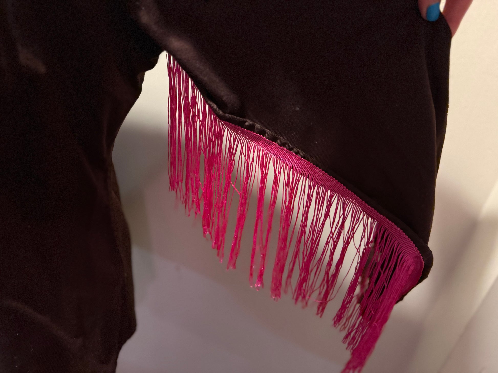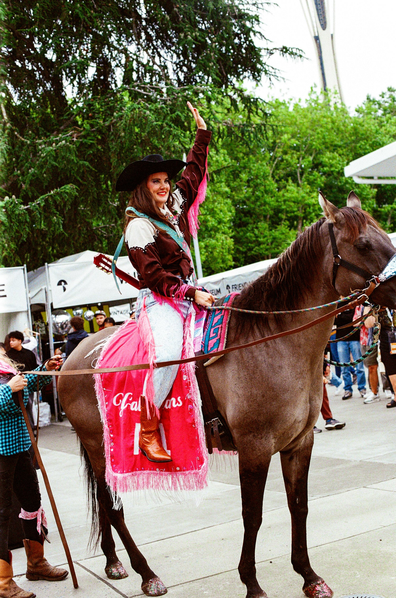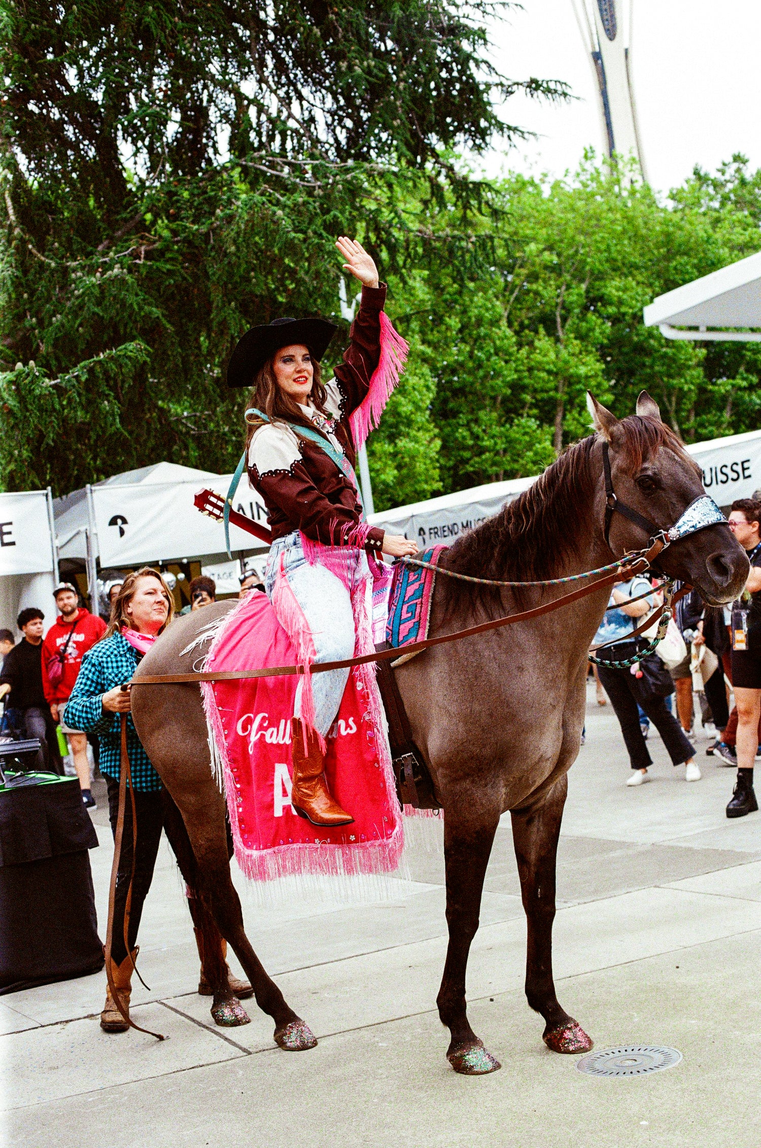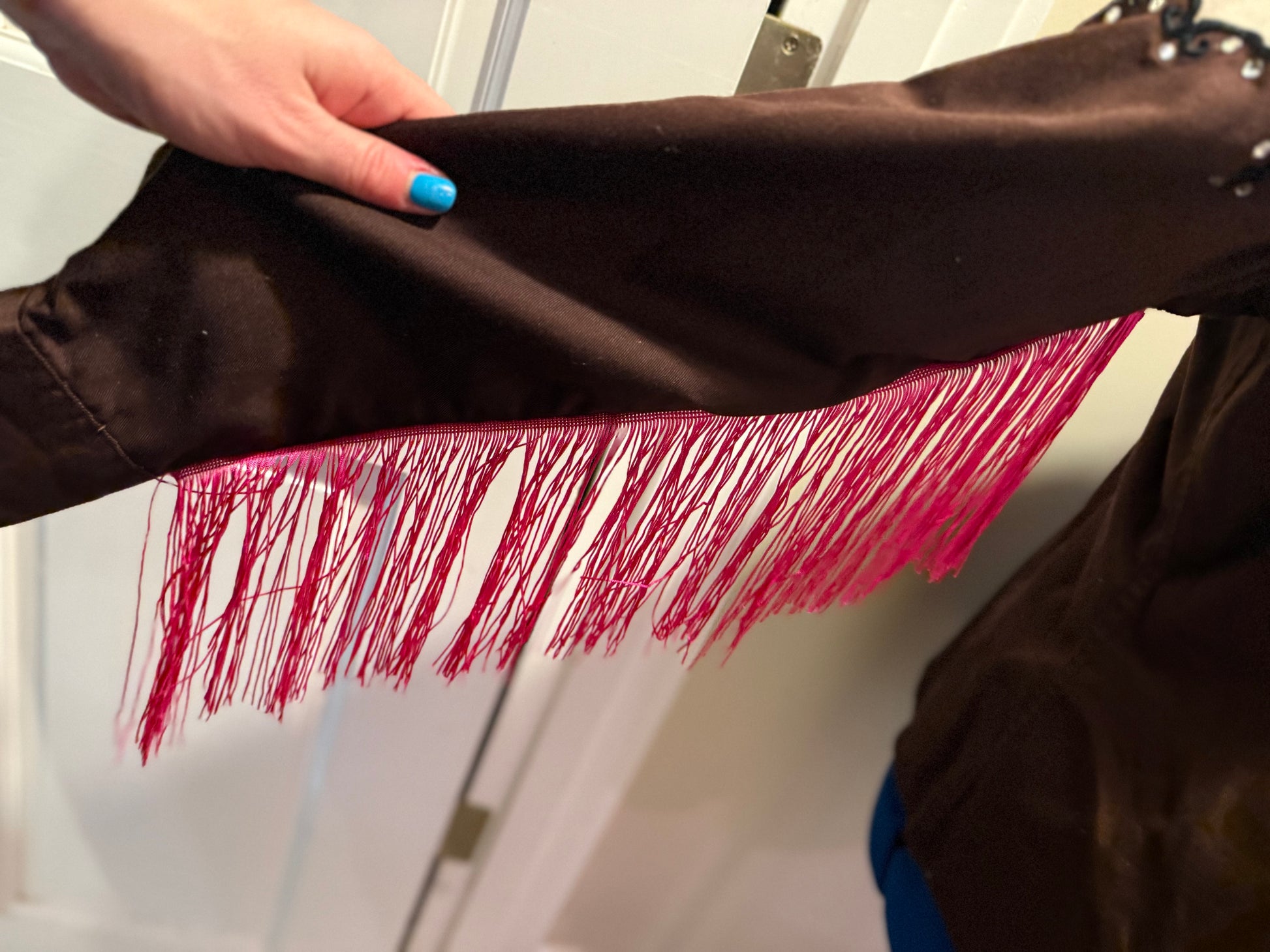 Features: An expression of queer joy on a vintage western embellished pearl snap! The front features large pink roses while the back has THE Queer of the Rodeo on a horse with flag. Embellished rhinestones throughout; diamond-shaped pearl snaps, long-sleeves.