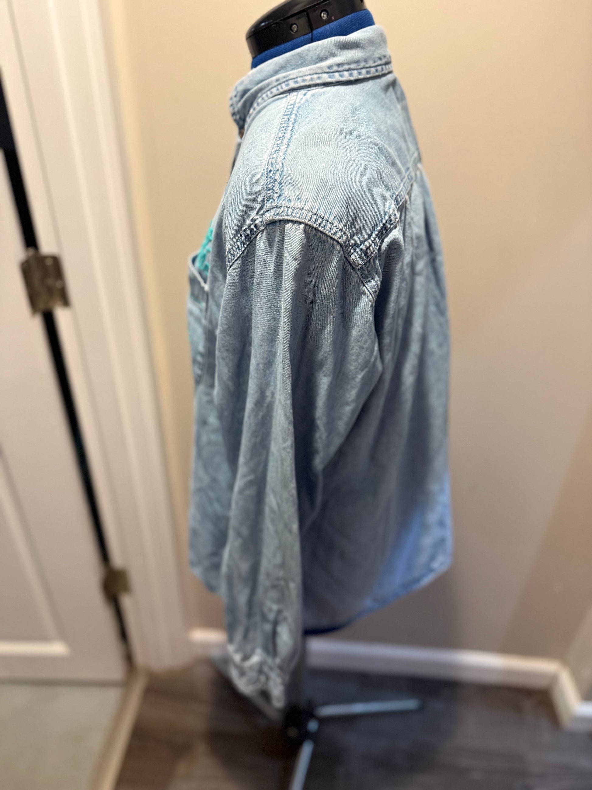 Features: Tell everyone how West Seattle is the Best Seattle with this vintage denim button-up long-sleeve shirt! "West Seattle, Best Seattle" stitched in teal thread on the chest pocket with a teal heart + white "WS" stitched near the left wrist.