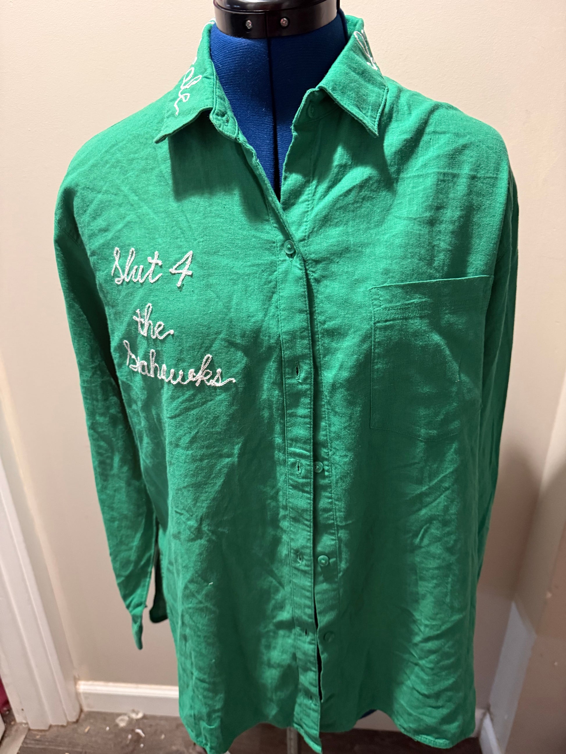 "Slut 4 the Seahawks" Green Button-Up L/S Collared Shirt - MD